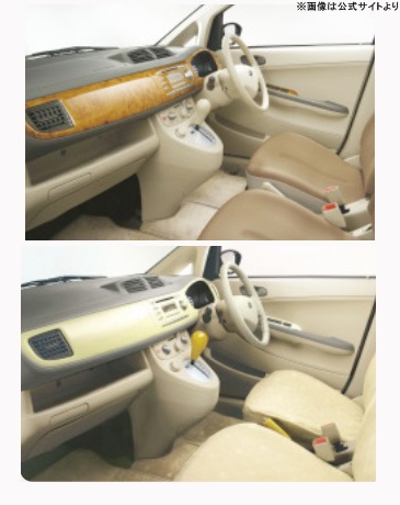 インテリアではインパネをそっくり変えることができ、サテンシルバーやウッドタイプ、アクアやクリームの4種類を用意、またパーキングレバーやシフトノブにもウッドタイプが設定されていました。